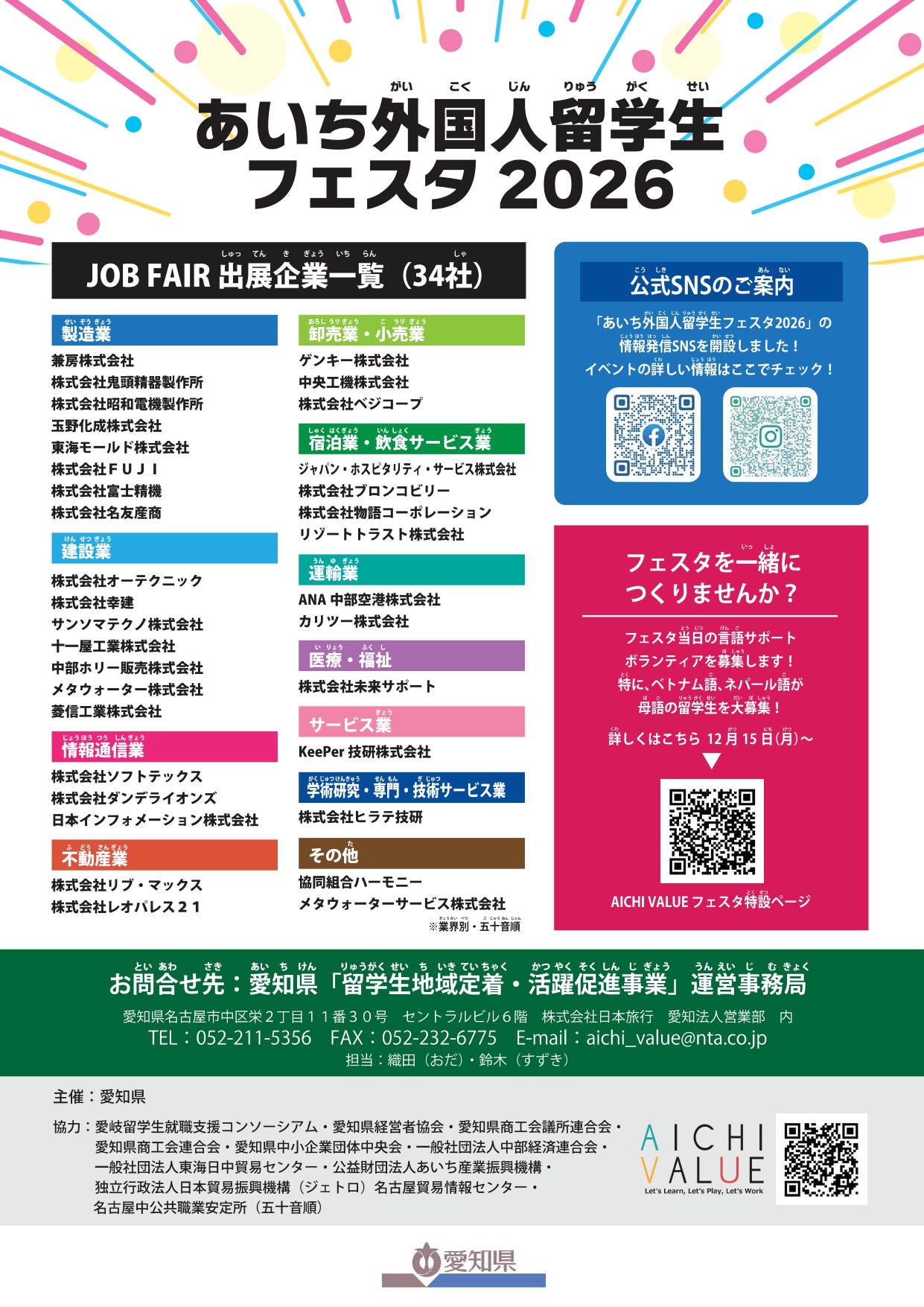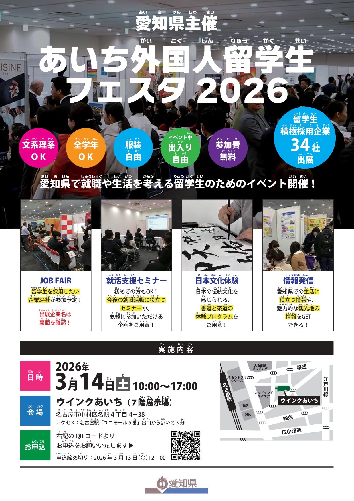 【学外情報】愛知県主催「あいち外国人留学生フェスタ2026」開催のお知らせ