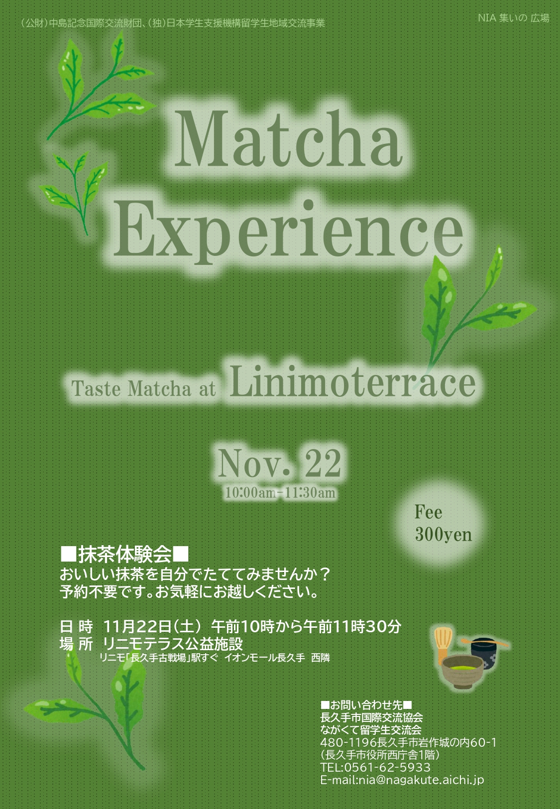 【学外情報】長久手市国際交流協定より「お抹茶体験会」のお知らせです 長久手市国際交流協会よりお抹茶体験会のお知らせが届きました🍵 ・日程:2025年11月22日(土) ・時間:10:00~11:30 ・場所:リニモテラス公益施設 ・参加費:300円 予約なしで参加OK! イオンモール長久手の西隣にある施設で行います! おいしいお抹茶を自分でたててみませんか? 是非参加してみてください!