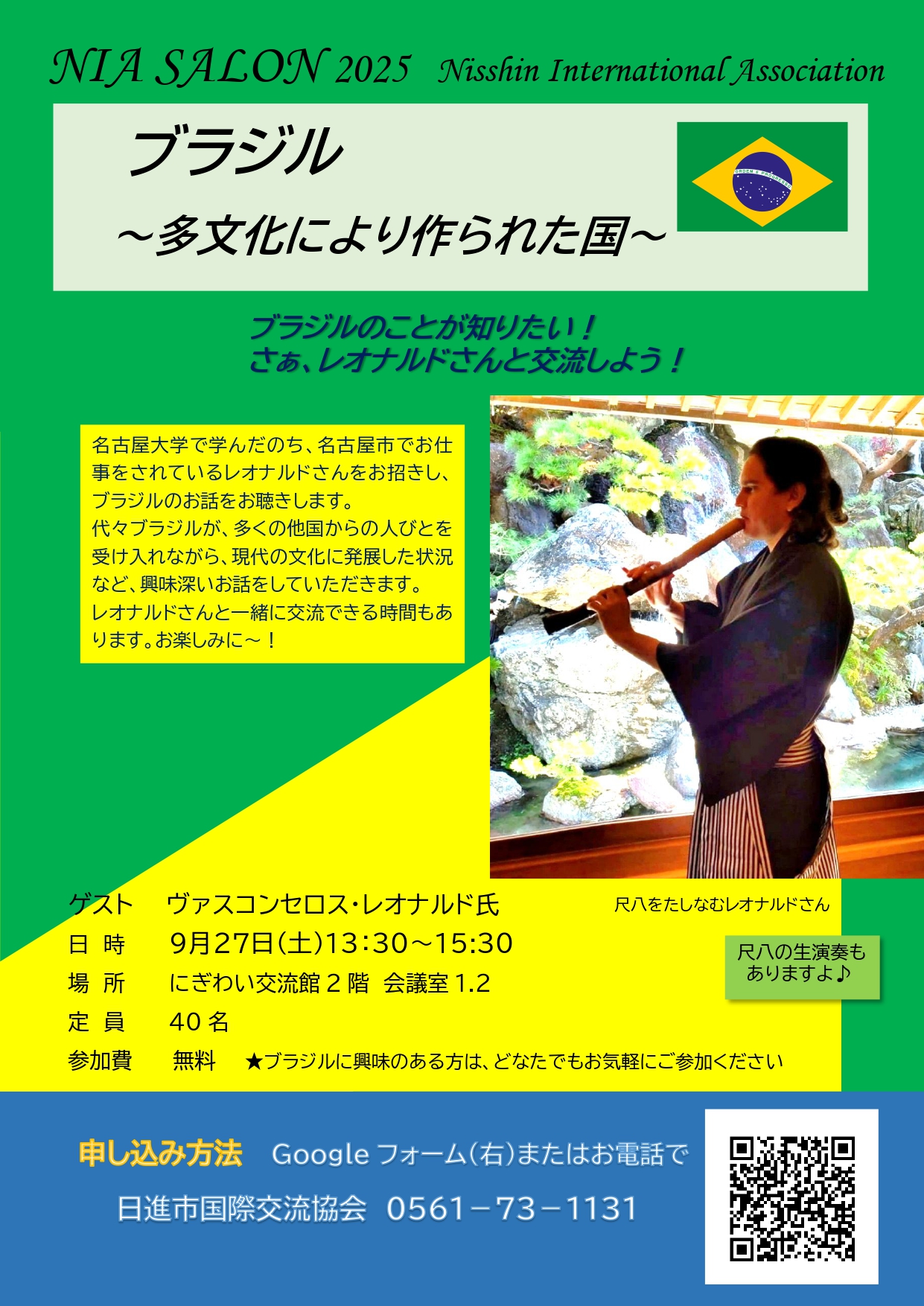 ブラジルについての興味深いお話や、レオナルドさんによる尺八の生演奏会など開催予定です。